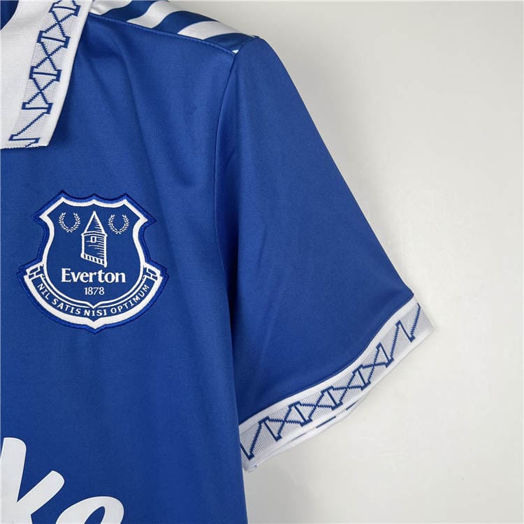 Everton 23-24 Home Football Kit manufactured by Hummel. for intended purpose, of satisfactory quality, not damaged  and capable of any agreed standard of performance it has no holes  and no stains or color bleeding . also the  badges and logos are intact and details are the same as authentic kit